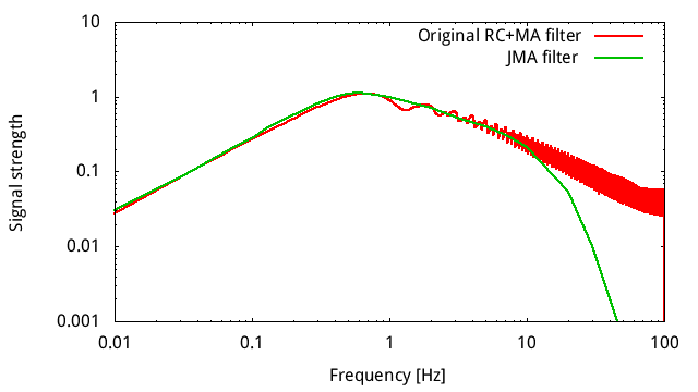 フィルタ特性 (JMA filter は気象庁の震度計算のためのフィルタ特性)
