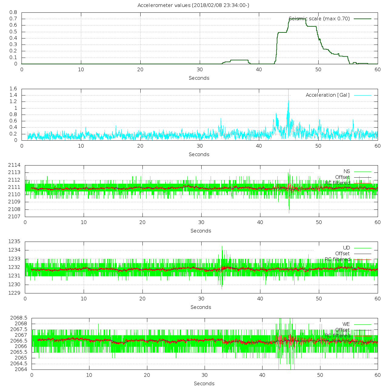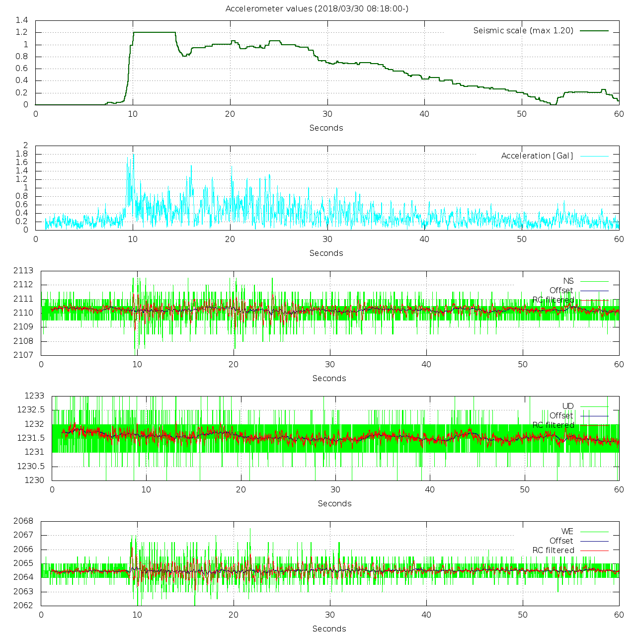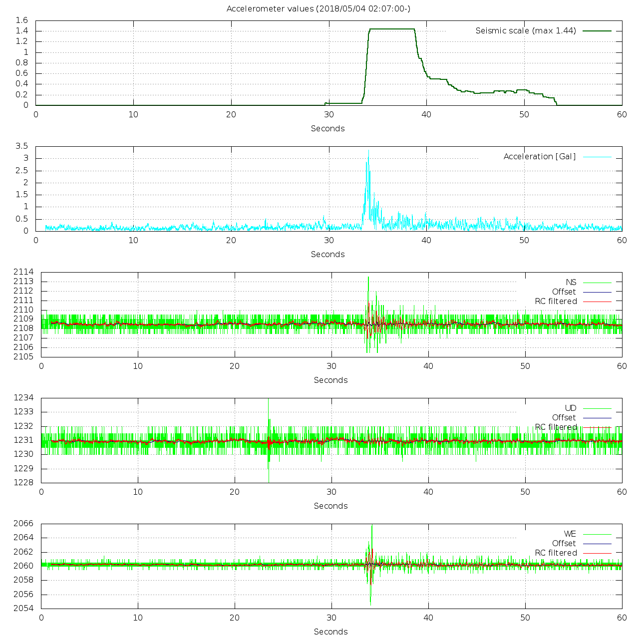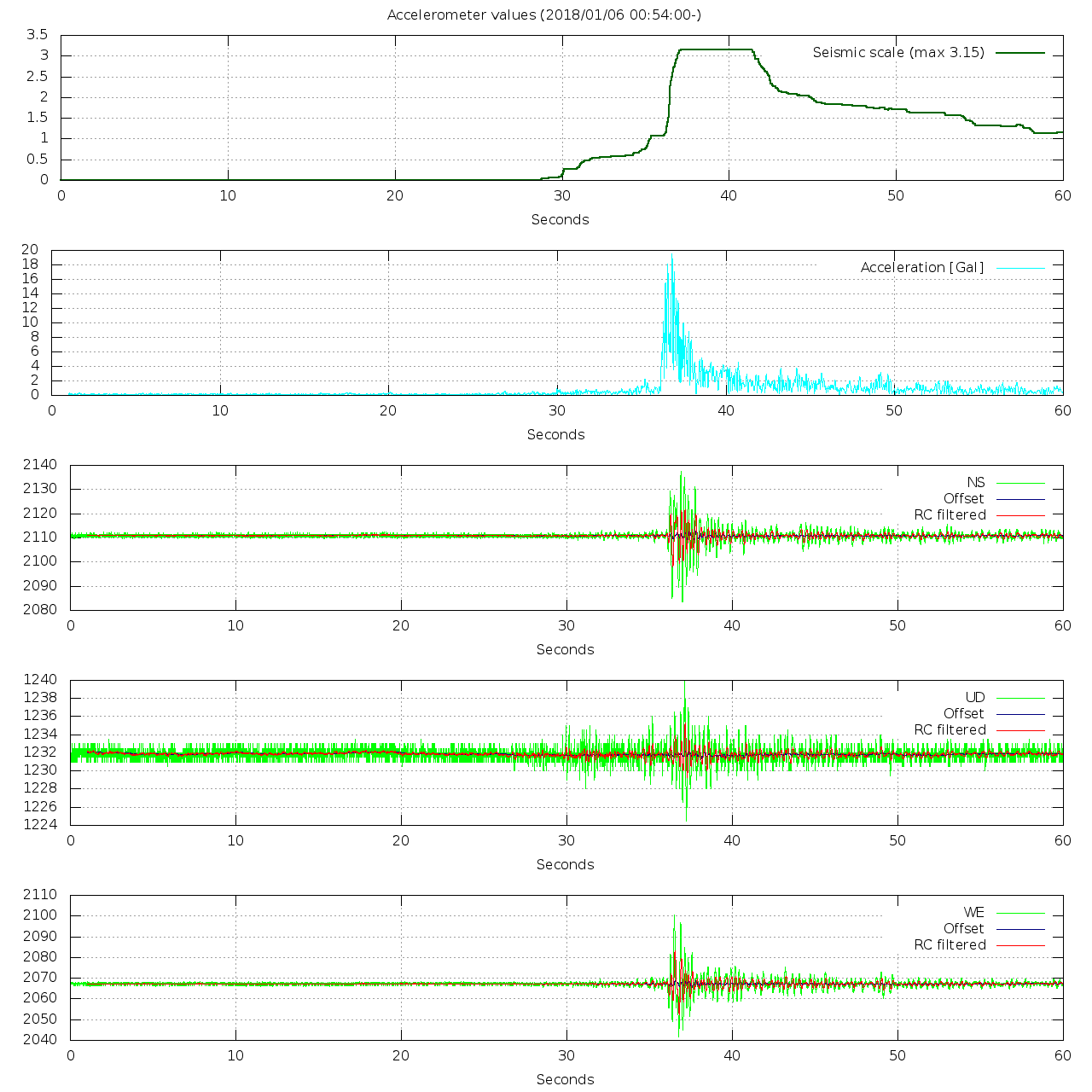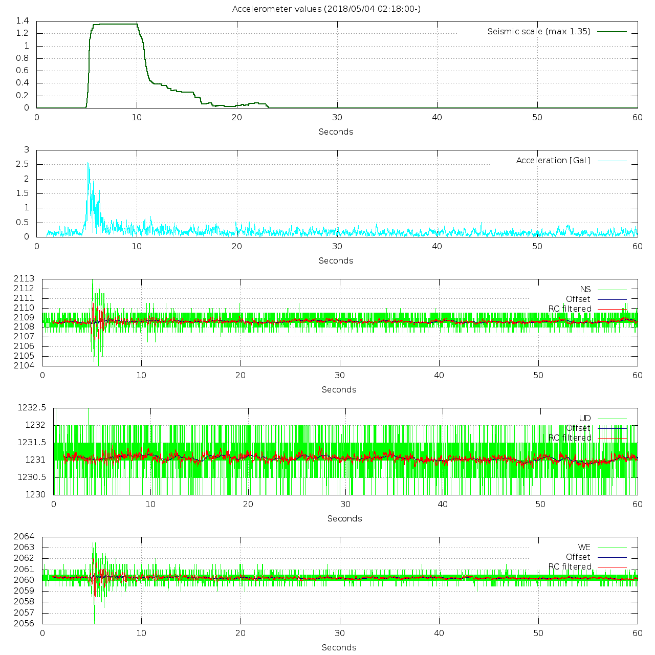 - 波形グラフは上から [震度] [加速度] [南北] [上下] [東西] です。