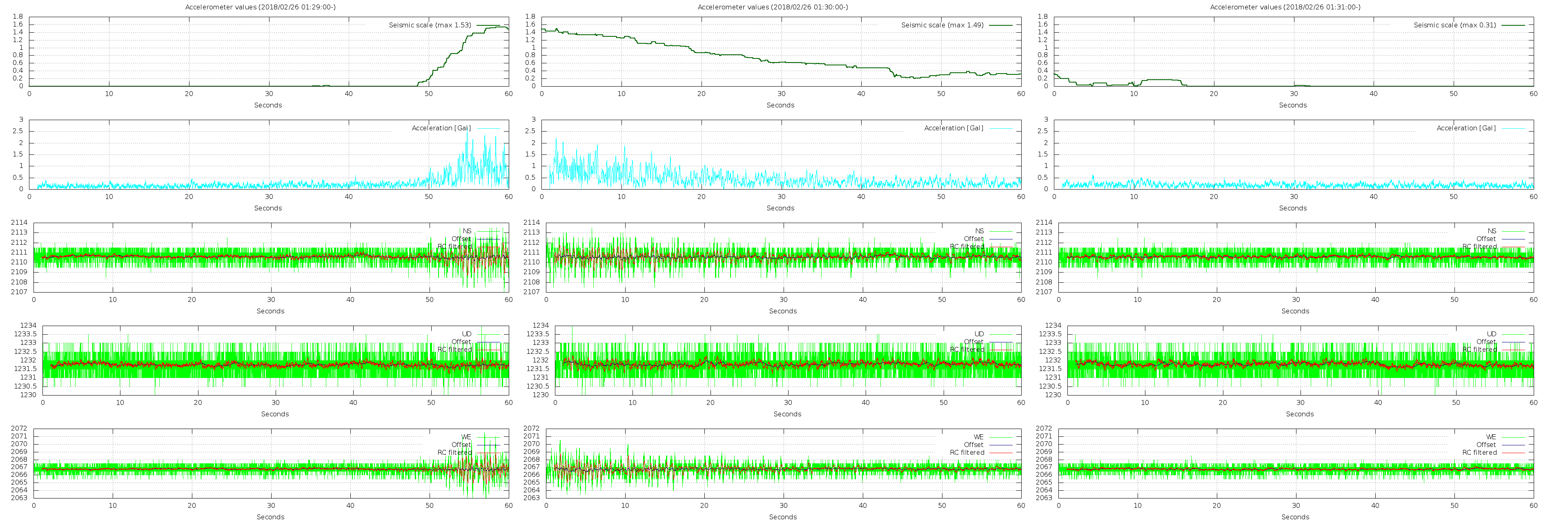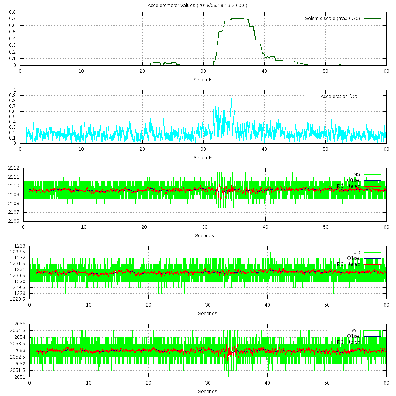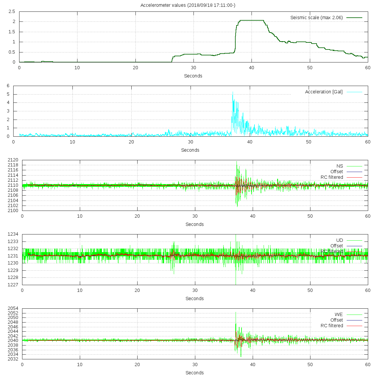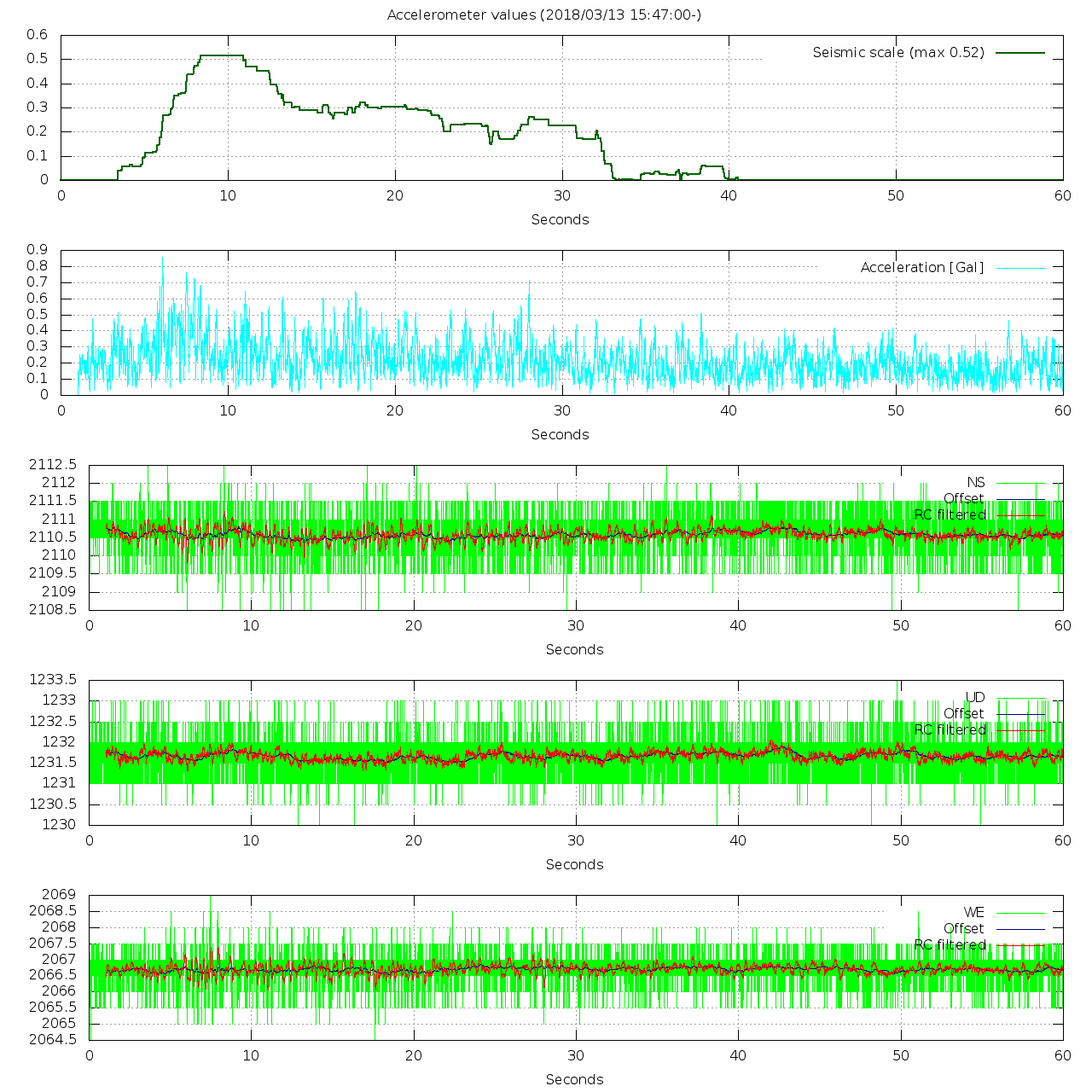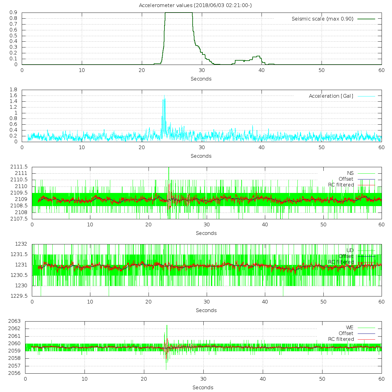 - 波形グラフは上から [震度] [加速度] [南北] [上下] [東西] です。