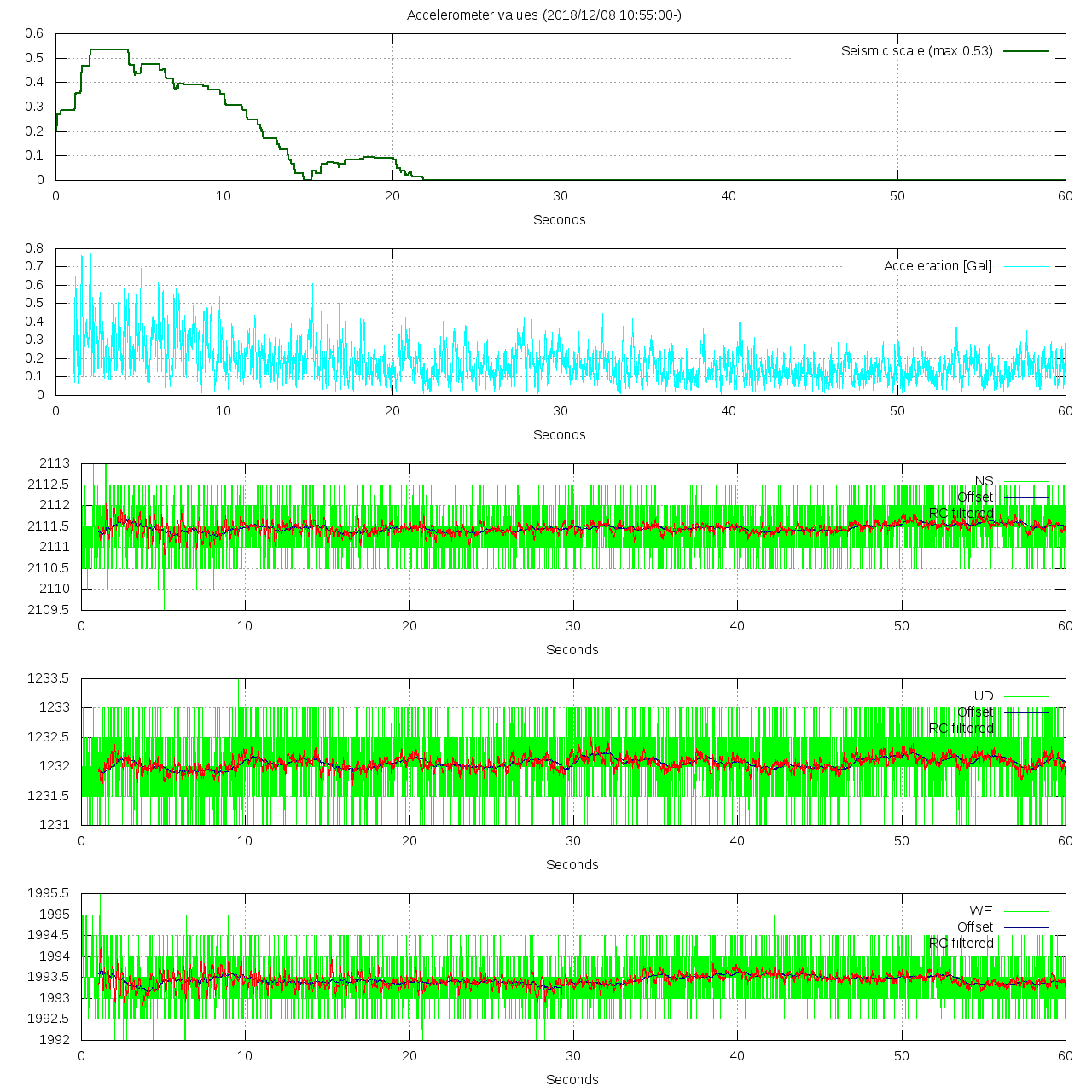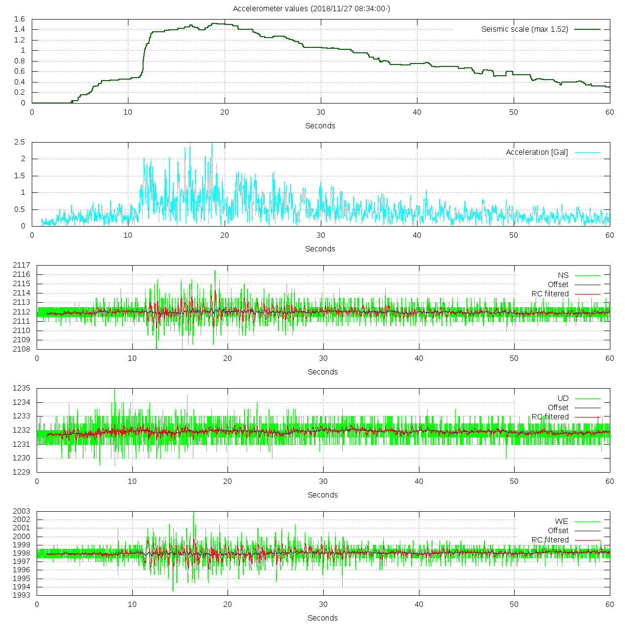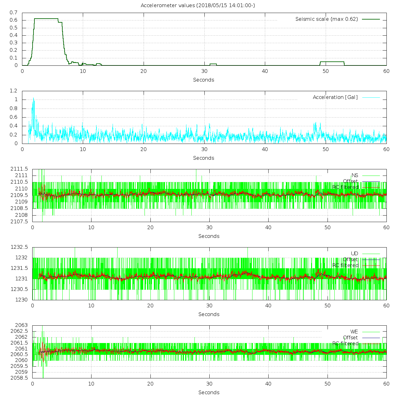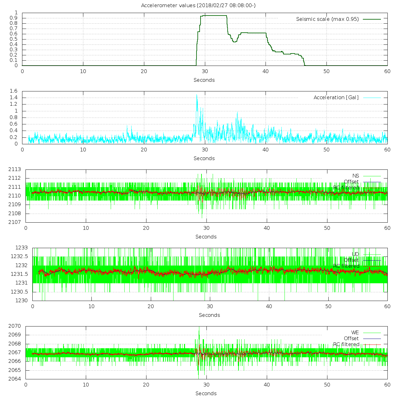 - 波形グラフは上から [震度] [加速度] [南北] [上下] [東西] です。