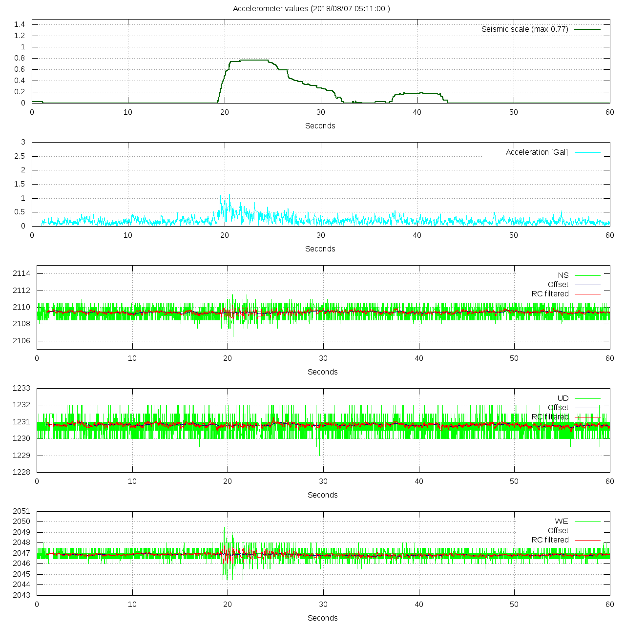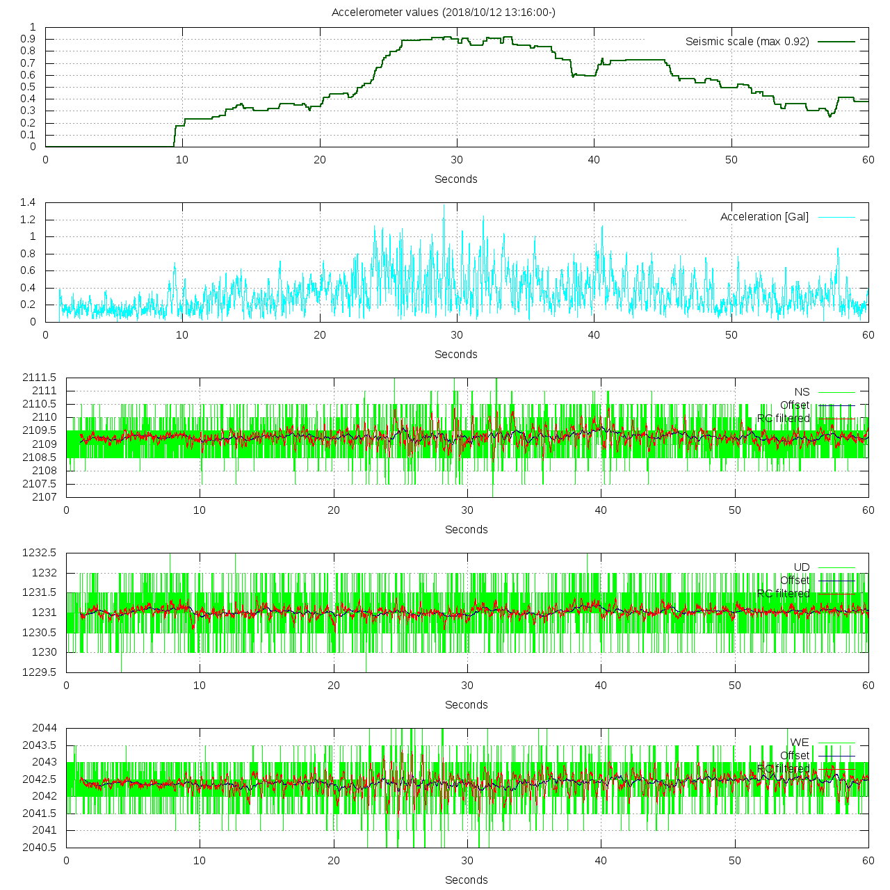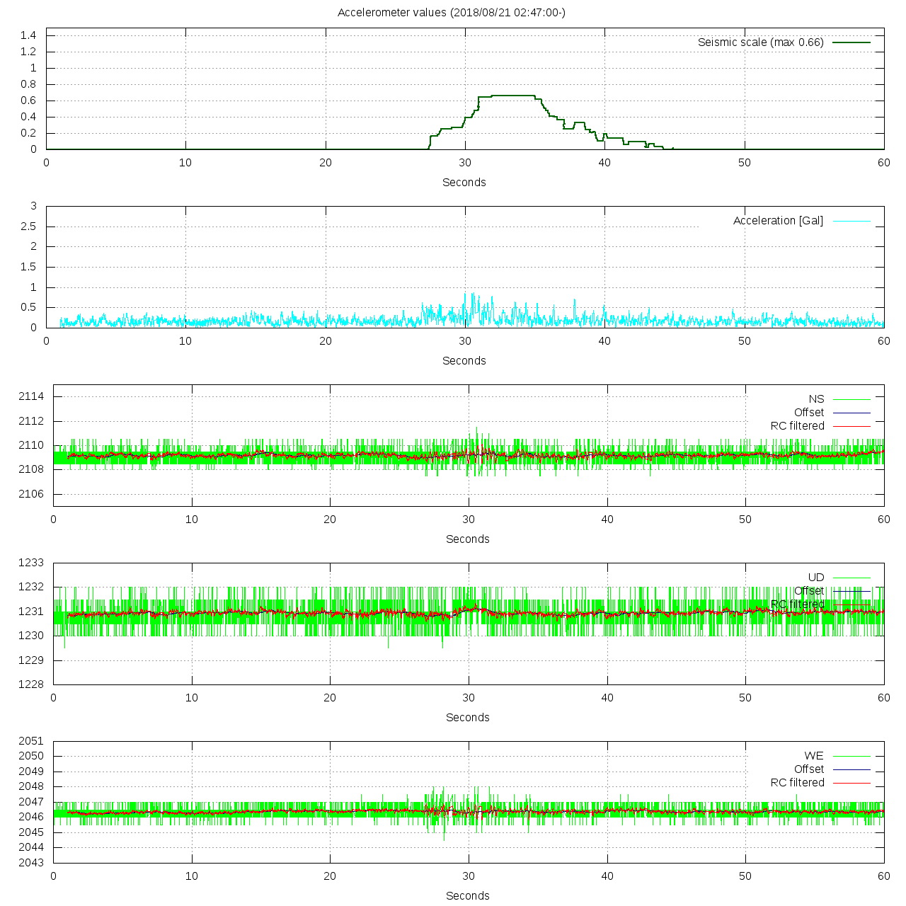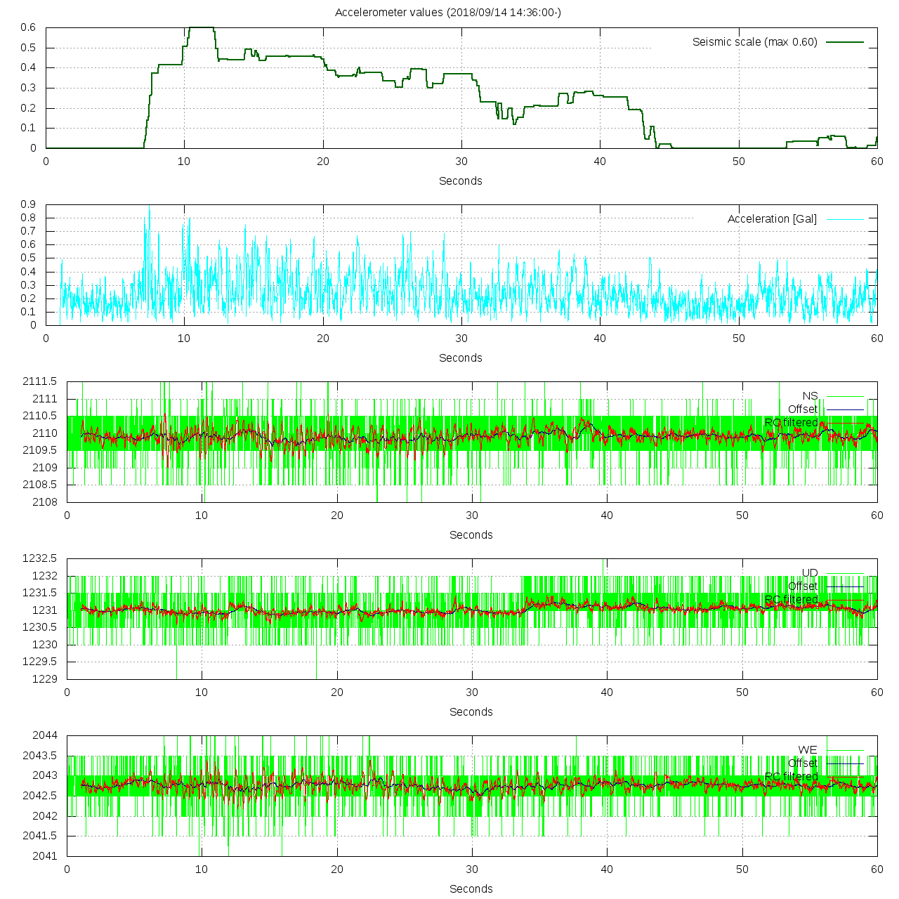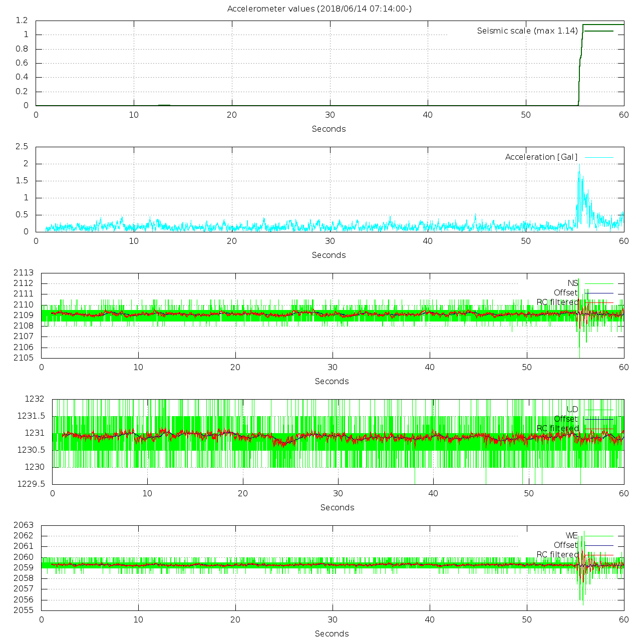- 波形グラフは上から [震度] [加速度] [南北] [上下] [東西] です。