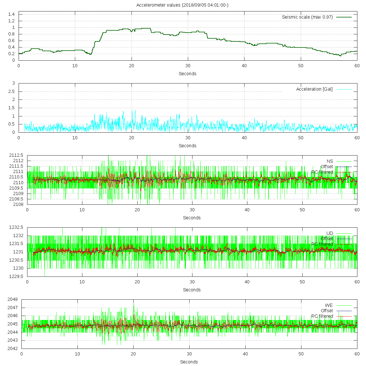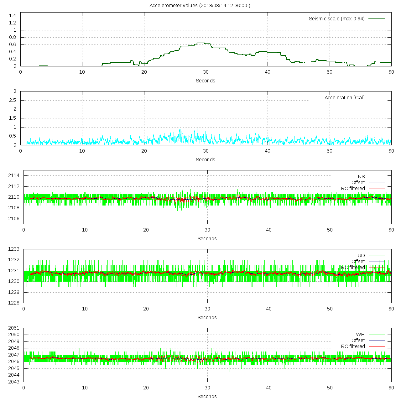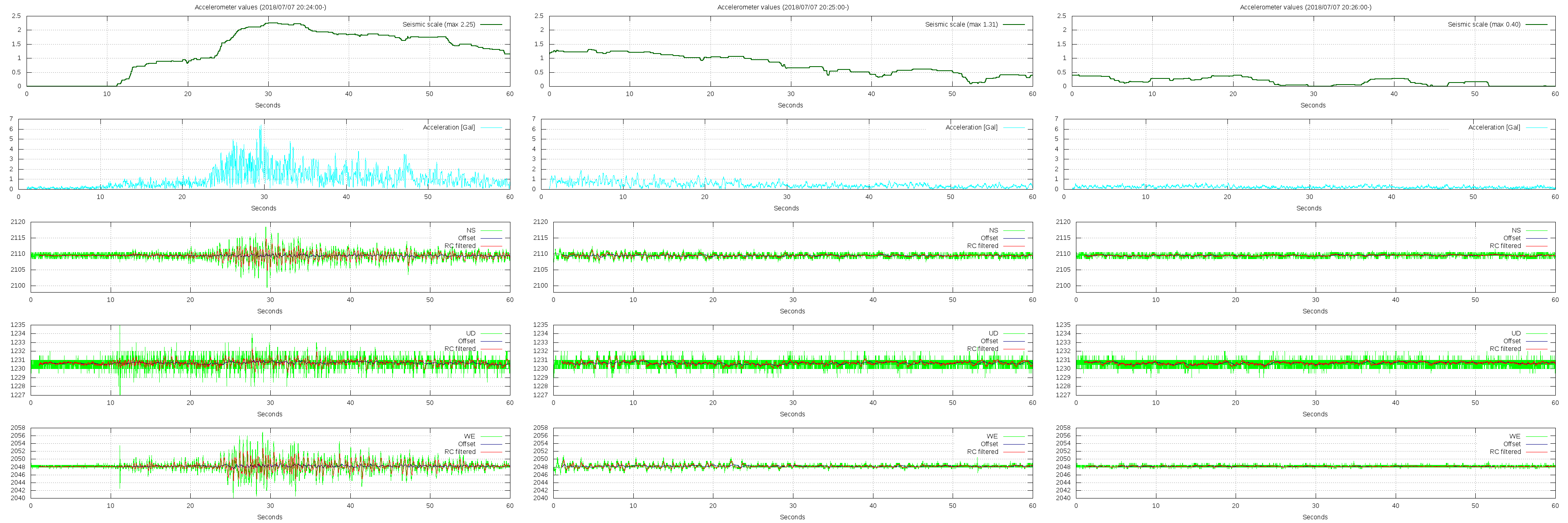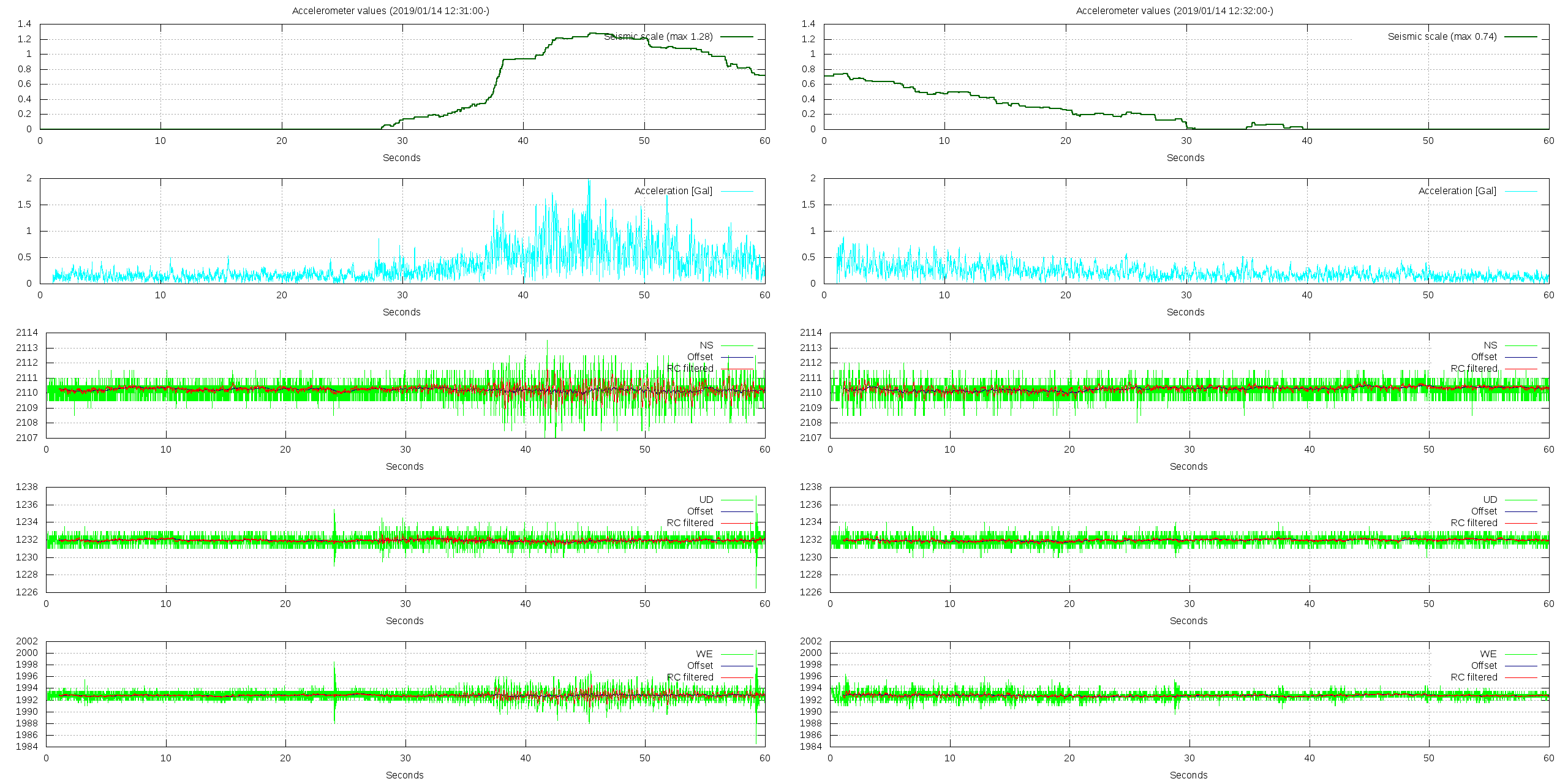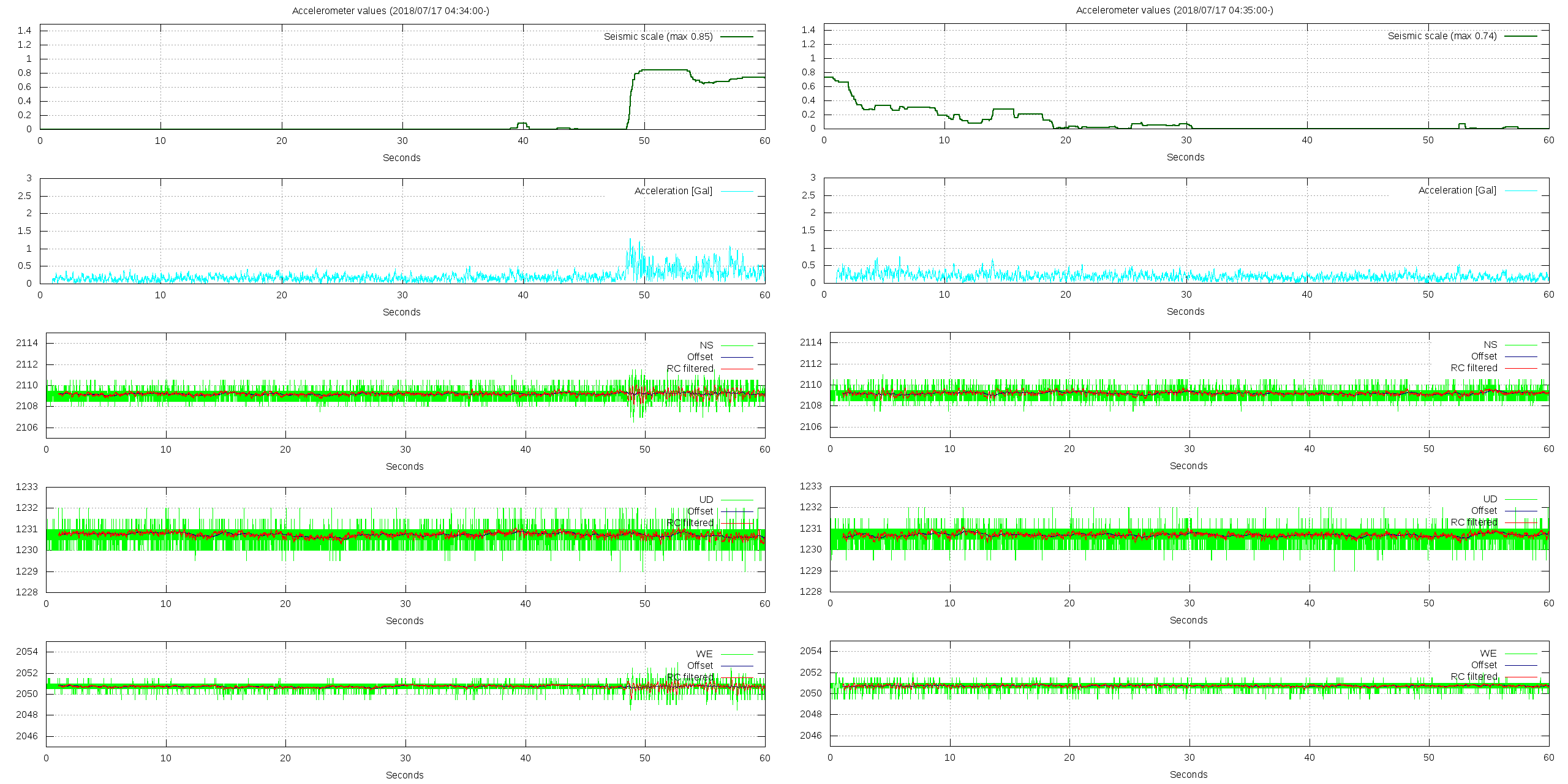 - 波形グラフは上から [震度] [加速度] [南北] [上下] [東西] です。