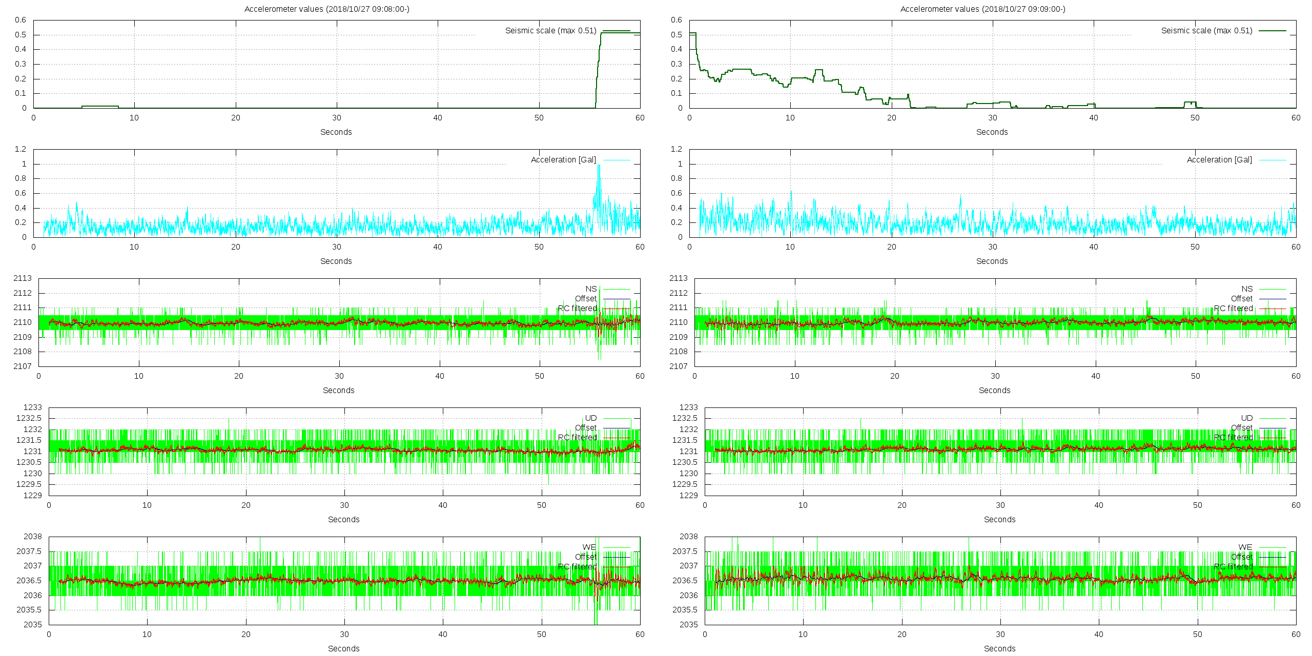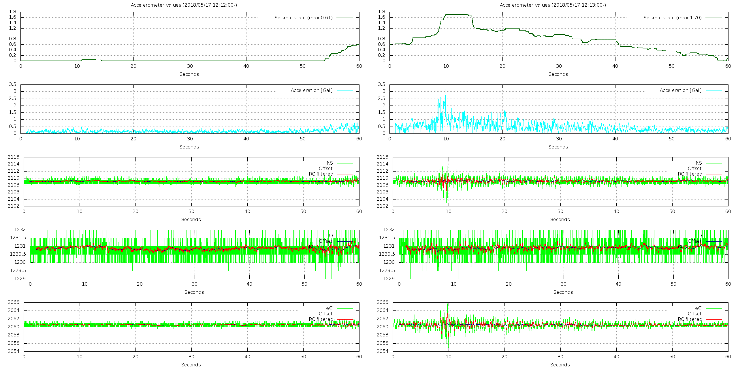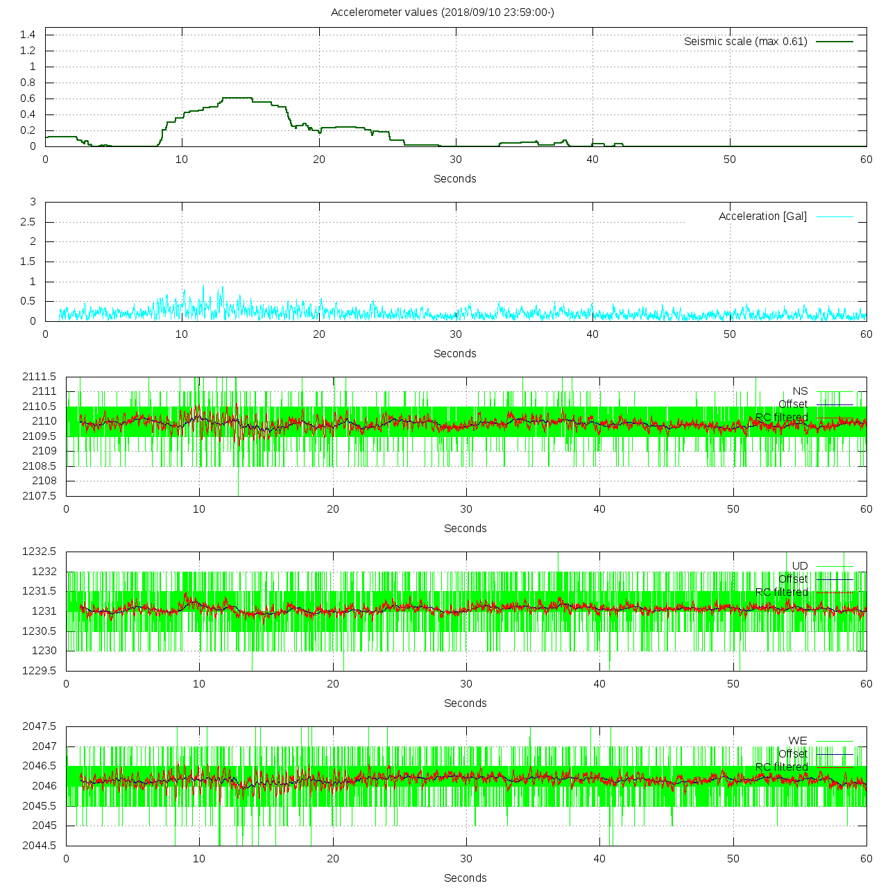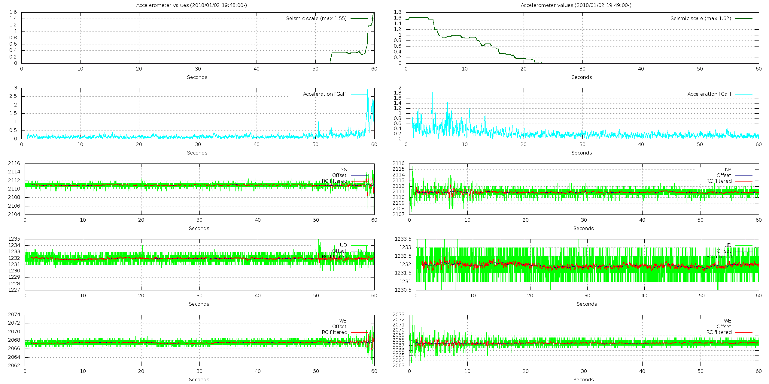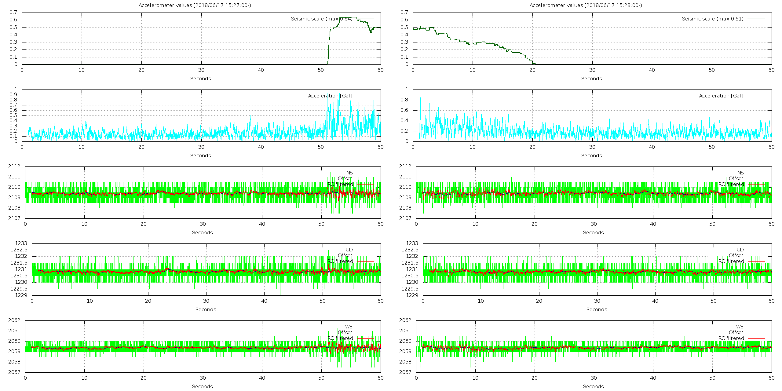 - 波形グラフは上から [震度] [加速度] [南北] [上下] [東西] です。