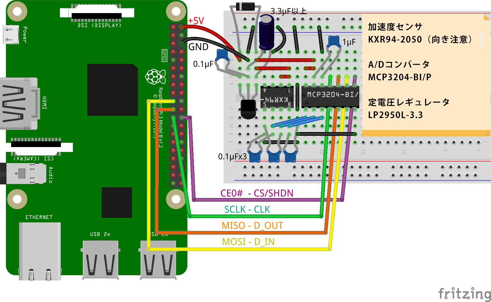 | コンデンサ(3.3μF 以上) | 1 個 | 秋月 P-10590(例) | セラミックコンデンサ可 |